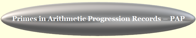 | 25 | (27661372 + 366384 • n) • 23# + 45214991 | 8132758706802551 | 0..24 | 16 | 17 May 2008 | Raanan Chermoni & Jaroslaw Wroblewski |